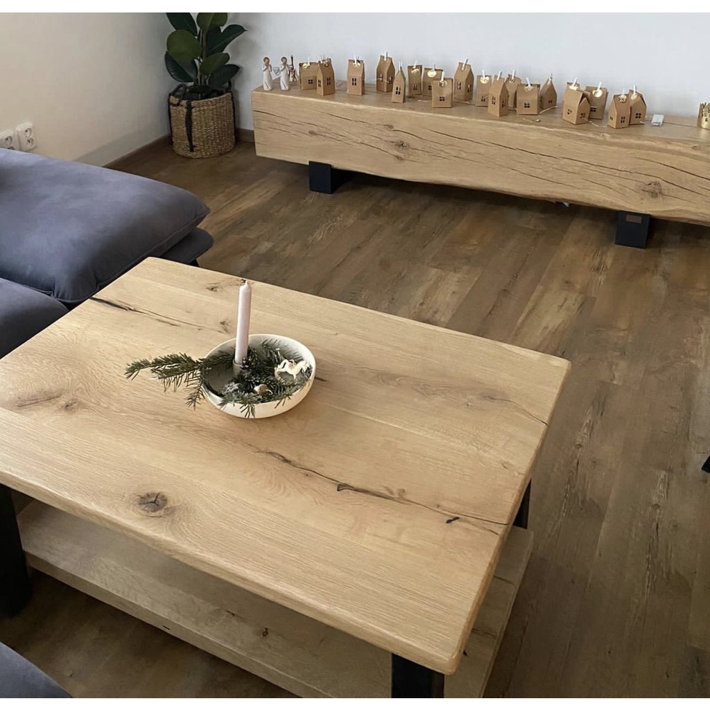 Masivní dubová deska v rustikálním provedení dodává stolku přírodní vzhled. Desky mohou obsahovat trhliny a suky. To vše podtrhuje jedinečný charakter každého kusu nábytku.
